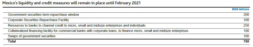Since 21 April, Banxico has made MXN750 billion ($35 billion) available as part of its pandemic-related relief measures (see exhibit), those now extended until February 2021. The central bank has also opened its discount window to a wider range of corporate and government securities (a measure also available to development banks), lowered banks’ reserve requirements, offered secured financing at low rates and asset swaps to small and midsize enterprises (SMEs). The credit facilities directed to the SME segment most affected by the pandemic totaled MXN350 billion, a relatively small amount versus other Latin American governments’ credit lines.