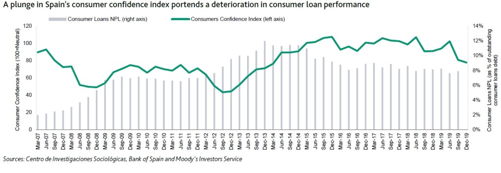 Spain, January 7, 2020 – Centro de Investigaciones Sociológicas (Center for Sociological Research, or CIS) reported that Spain’s consumer confidence index had plunged to 77.7 in December 2019, 13 points below the levels in December 2018 and the lowest level since 2013. The significant decline in consumer confidence, consistent with other negative data reported in recent days, is credit negative for asset-backed securitisations (ABS) collateralised by Spanish consumer loans. Consumer confidence data provide a forward indicator that asset risks will increase and consequently weaken the performance of securitised loans. Falling consumer confidence somewhat correlates to weaker future performance in consumer credit, as the exhibit shows. Indeed, consumer confidence plunged in mid-2007 before Spanish consumer nonperforming loan (NPL) ratios surged.